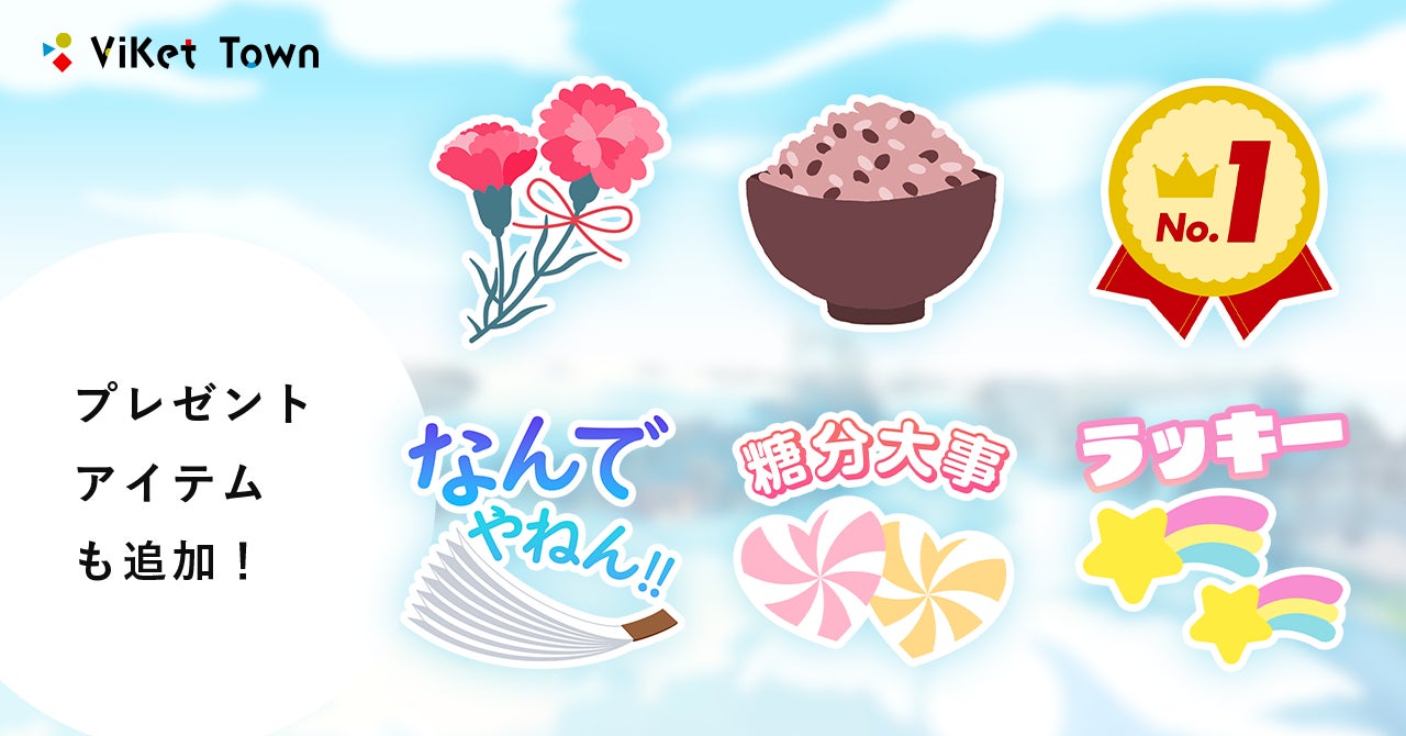 ViKet Townではプレゼントやメッセージ付きアイテムも毎月更新中。コミュニケーションを促すスタンプや、5月のイベントを盛り上げるアイテム、おめでたい場面で使いたいメッセージも新登場!