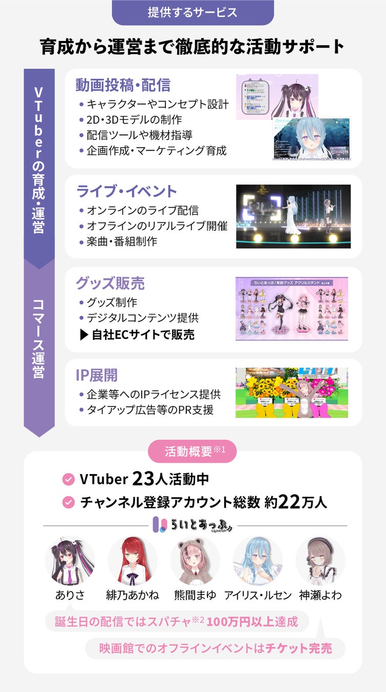 クリエイターとして輝くためのマネジメントだけでなく、動画配信やイベント開催時の裏方作業を含め、VTuber業界で生き抜くために必要なスキルを幅広く教育しています。