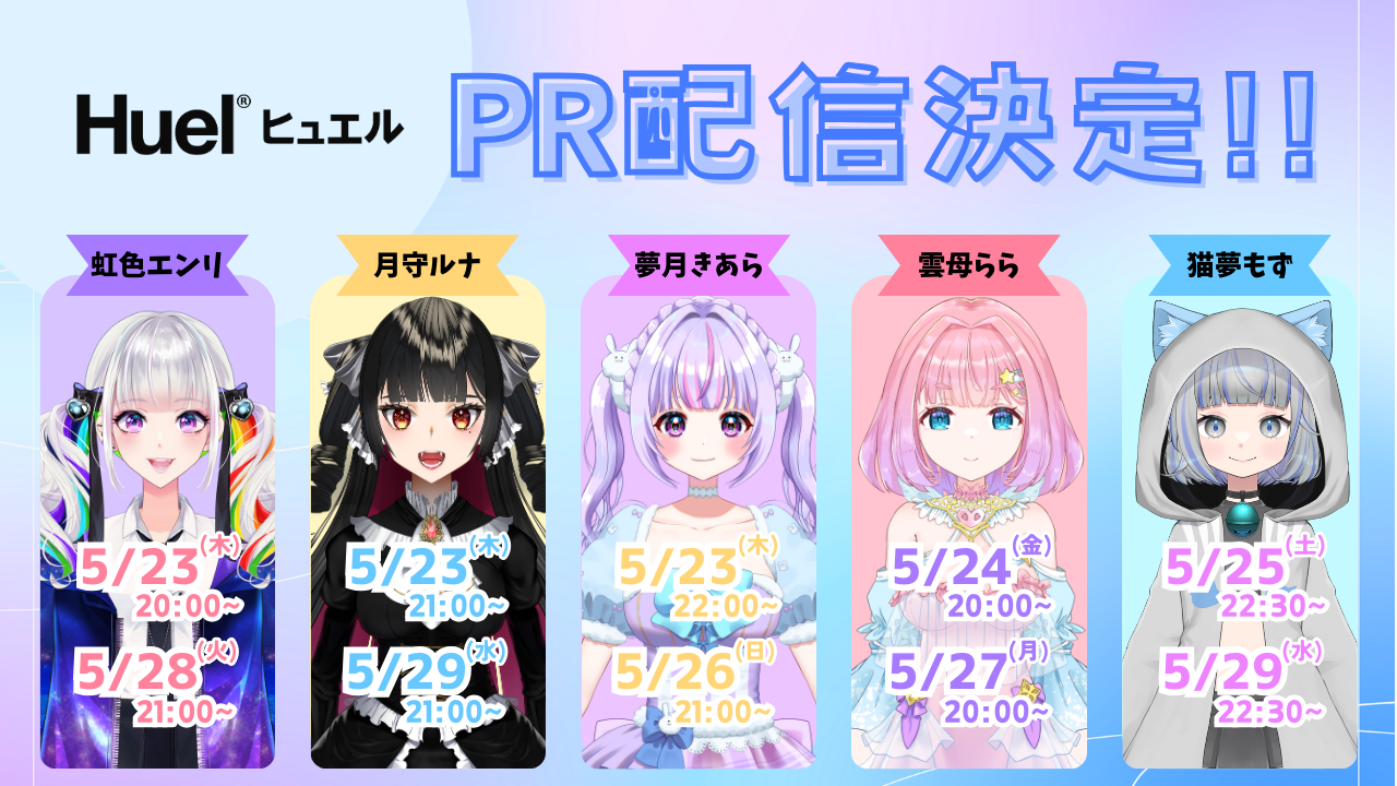 株式会社コレカティス(本社:東京都渋谷区、代表取締役:伊藤海斗、以下:CORECATIS)は、弊社が運営するCORECATIS VIRTUAL PROJECTにて所属の「月守ルナ」「雲母らら」「夢月きあら」「猫夢もず」「虹色エンリ」の5名が 世界100カ国以上で累計2億5千万食以上販売を記録している完全栄養食「Huel」とのタイアップが決定致しました。