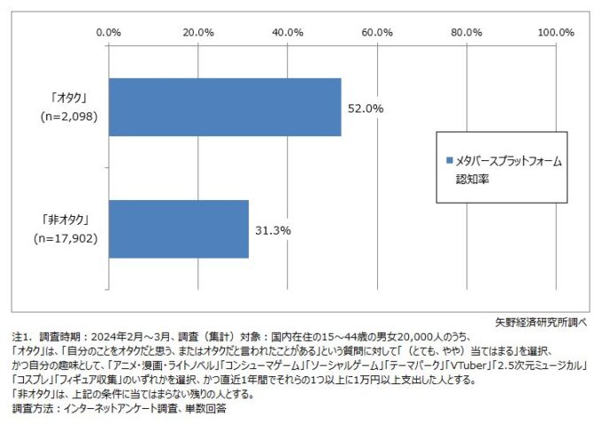 アンケート結果について、「Fortnite」や「VRchat」などのメタバースプラットフォームの名前を知っているかどうかという質問には、52.0%の「オタク」が知っていたが、「非オタク」は31.3%と20ポイントほど差が出た。この結果を持って、矢野経済研究所は「あくまでもアンケート調査の結果であるが『オタク』はメタバースサービスとの親和性があると考える」とコメントしている。