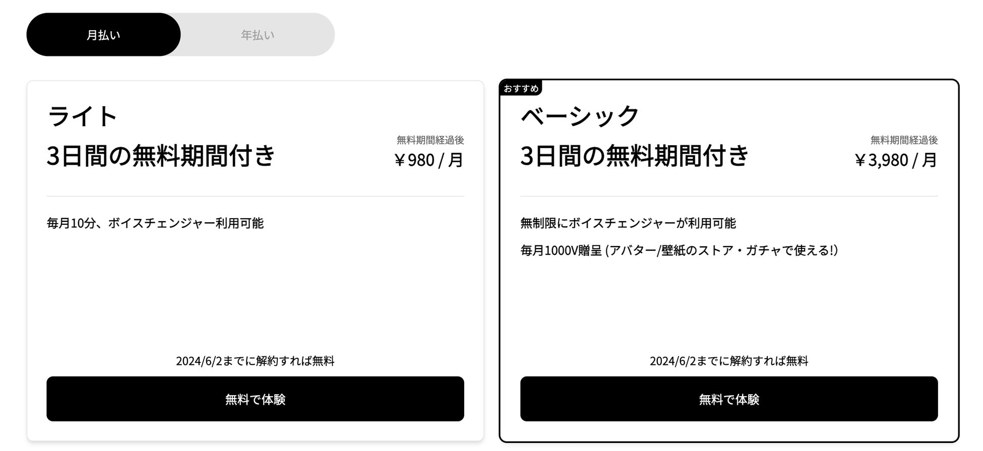 ボイスチェンジャーは2つのサブスクプランからご利用できます。