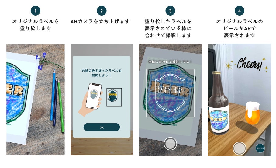 本ARは特別なアプリをダウンロードすることなく、塗り絵したオリジナルラベルをスマホで撮影するだけで簡単にオリジナルラベルのクラフトビールをプレゼントできるAR体験です。