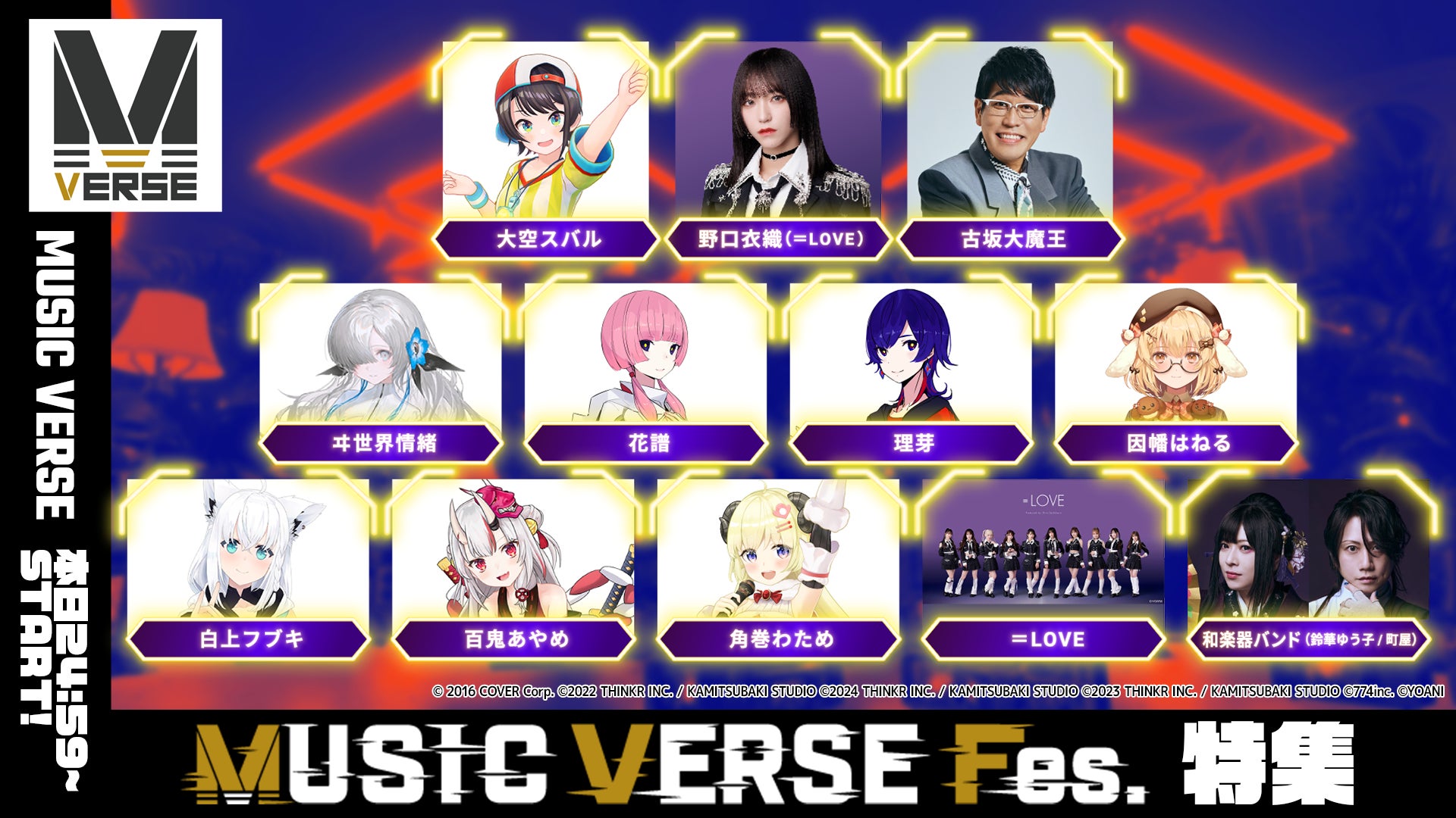 大空スバル、野口衣織(=LOVE)、古坂大魔王らMC陣と、ヰ世界情緒、因幡はねる、花譜、白上フブキ、角巻わため、百鬼あやめ、理芽など、MUSIC VERSEに過去出演し、放送を盛り上げたバーチャルアーティストと、=LOVE、和楽器バンド(鈴華ゆう子/町屋)らリアルアーティストの豪華パフォーマンスをお見逃しなく!