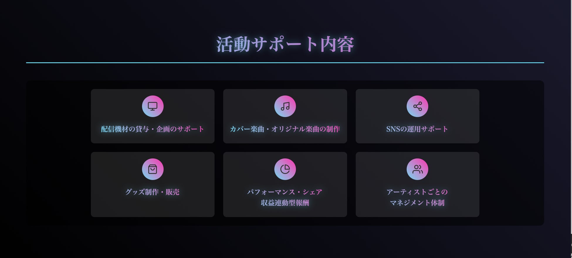 才能がある方でも埋もれてしまう今の時代において、私たちはそんな燻っている未来のアーティストをコンテンツ制作・プロデュース面で全力サポートします。