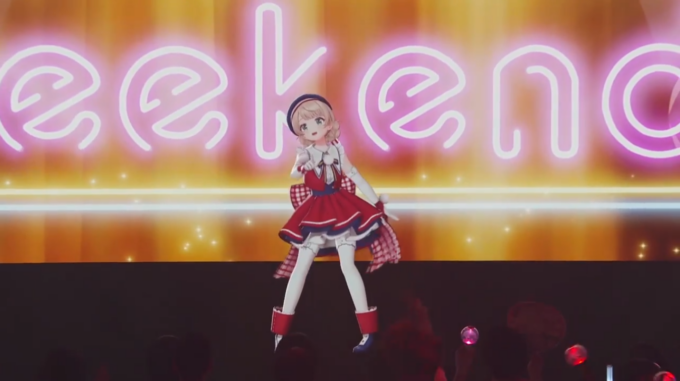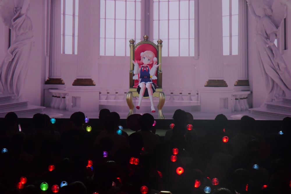 最後のセリフに客席が大喜びしている中、スクリーンは真っ暗に。荘厳な鐘の音と共に明るくなると、見えてきたのは、王様のような豪奢な椅子に座って俯いているういちゃんの姿。流れて来たのは、大ヒットボカロ曲『神っぽいな』。信者たちに崇められる『ロリ神』な姿を観た直後だからか、人生に達観したような歌詞の楽曲でありながら、しぐれうい(9さい)が可愛く歌って違和感を感じない。逆に、宮殿のような背景も含めて、カバー曲のステージだとは思えないほど世界観が完成していた。