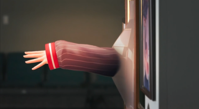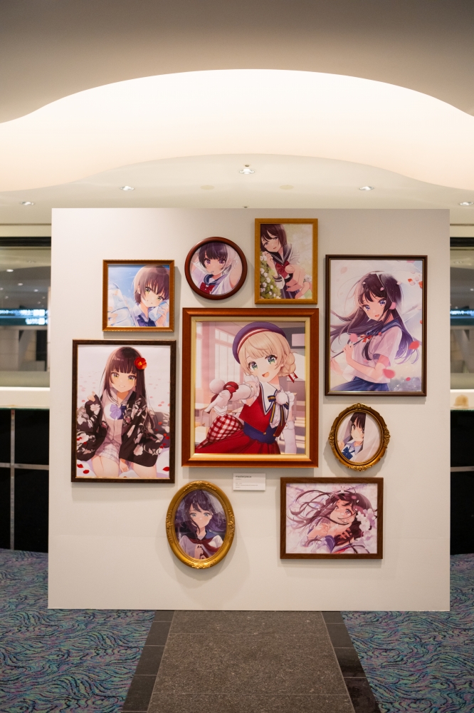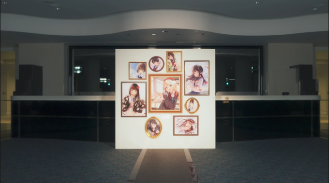 千燈さんの温かみのあるアナウンスでほっこりした空気になった直後、おそらく会場のどこかに展示された9枚のイラストがモニターに映る。そのすべてがしぐれさんの作品で、中央に飾られているのは、勢いよく突き出された右腕と楽しそうな笑顔が印象的なしぐれさんの姿。個展「雨を手繰る」では特大フィギュアも展示され注目を集めたライブキービジュアルのイラストで、5周年プロジェクトで描き下ろされたイラストの中でも特に印象強い作品の一つだ。イラストの下のプレートには、「masterpiece」というタイトルが書いてある。