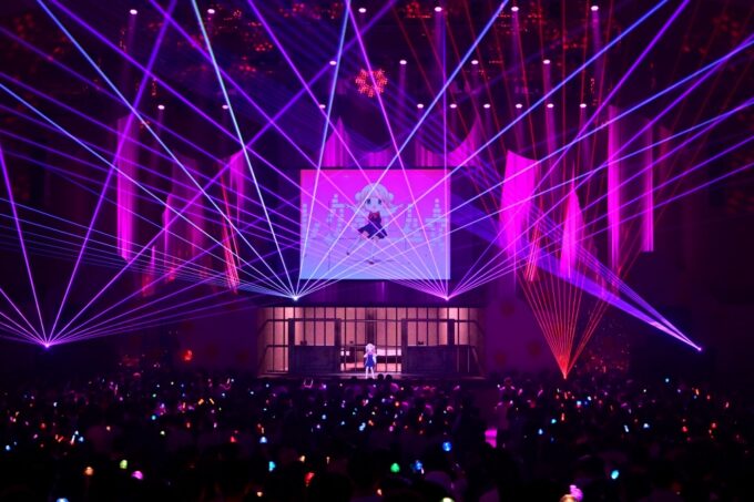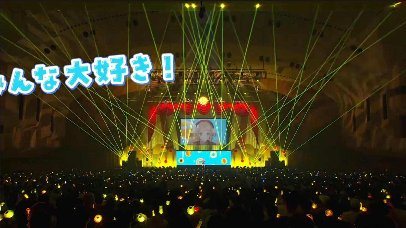 最大収容人数5000人を越えるパシフィコ横浜の国立大ホール。カメラに映る範囲は、当然、一切の空席がない。ライブ恒例の開演直前の会場アナウンスを担当したのは、しぐれさんがビジュアルを担当した二人目のVTuberである「ぶいすぽっ!」の女子高生(?)担当、千燈ゆうひさん。ライブ中の諸注意を伝えた後は、千燈さんのリードで「うい麦畑でつかまえて」のコーレス練習が行われた。
