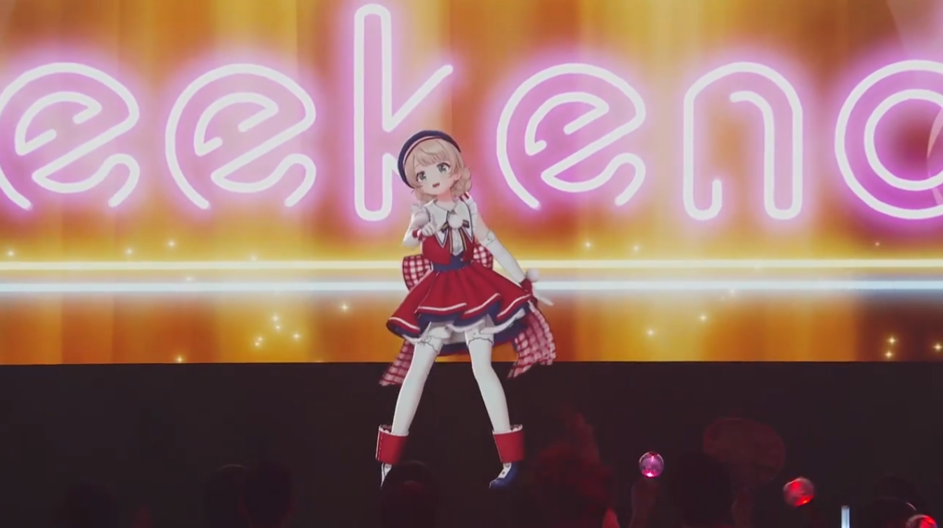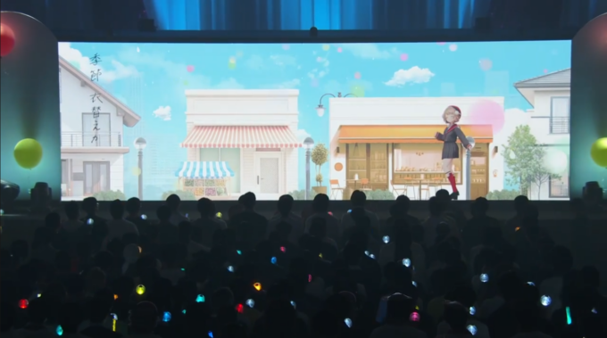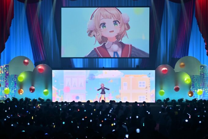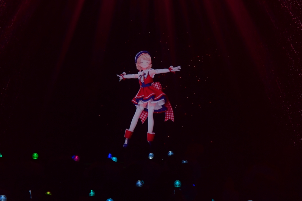 曲の終盤、可愛くパラパラダンスを踊っていると、VTuberにとってのステージであるスクリーンにノイズが走り始める。そして、曲の終わりと共にスクリーンが真っ暗になり、後光のような光が差す中、浮かんできたシルエットは、おさげでランドセルを背負った、あの小さな女の子の姿。しぐれうい(9さい)の登場に、観客の歓喜の声は、配信でもはっきり分かるほど、本日の最高のボリュームになっていた。
