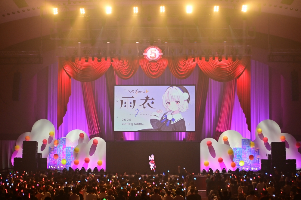 2曲歌った後のMCは、そのまま新衣装の紹介タイムへ移行。客席に向けて、「おい! 回れって言え!」と上からリクエストする姿も可愛い。告知コーナーでは、グッズの事後通販やこのライブの映像商品化も発表されたが、最大のサプライズは、バーチャルシンガー化決定の発表。音声創作ソフト『VoiSona』で、しぐれさんの歌声を元にしたバーチャルシンガー「雨衣」が2025年に発売予定と発表されたのだ。しぐれさんにそっくりだが、全体的に色素が薄目でシックな装いの雨衣ちゃん(14歳)。筆者は、音楽的センスは皆無だが、雨衣ちゃんとは仲良くしてみたい。