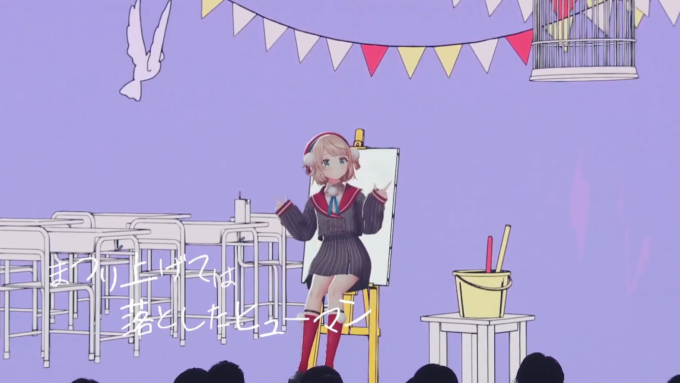 ライブ2日前の夜には、額縁に入った状態で「絵の中からこんばんは」と題した配信を行っていたしぐれさん。ライブ初心者に向けて「ライブ参戦の心得」を伝えるというライブ直前にぴったりな配信内容だったため、絵の中から配信していることに意味があるとは思っていなかったのだが、イラストの内容も含めて、このライブのオープニングに繋がっていた。まるで散歩にでも行くように気負いなくステージに向かう後ろ姿は、とても「VTuberしぐれうい」らしく、解釈一致だ。