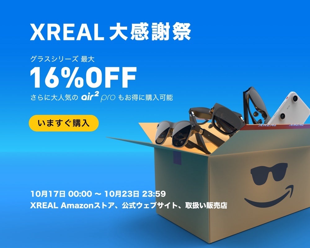 AR(拡張現実)グラスを開発・販売しているXREALは、2024年10月17日(木)~ 10月23日(水)の期間限定で、XREALが提供する人気のARグラスシリーズが最大16% OFFになる「XREAL秋の大感謝祭」を実施いたします。行楽シーズンのお出かけに最適なARグラスを、この機会にぜひご検討ください。