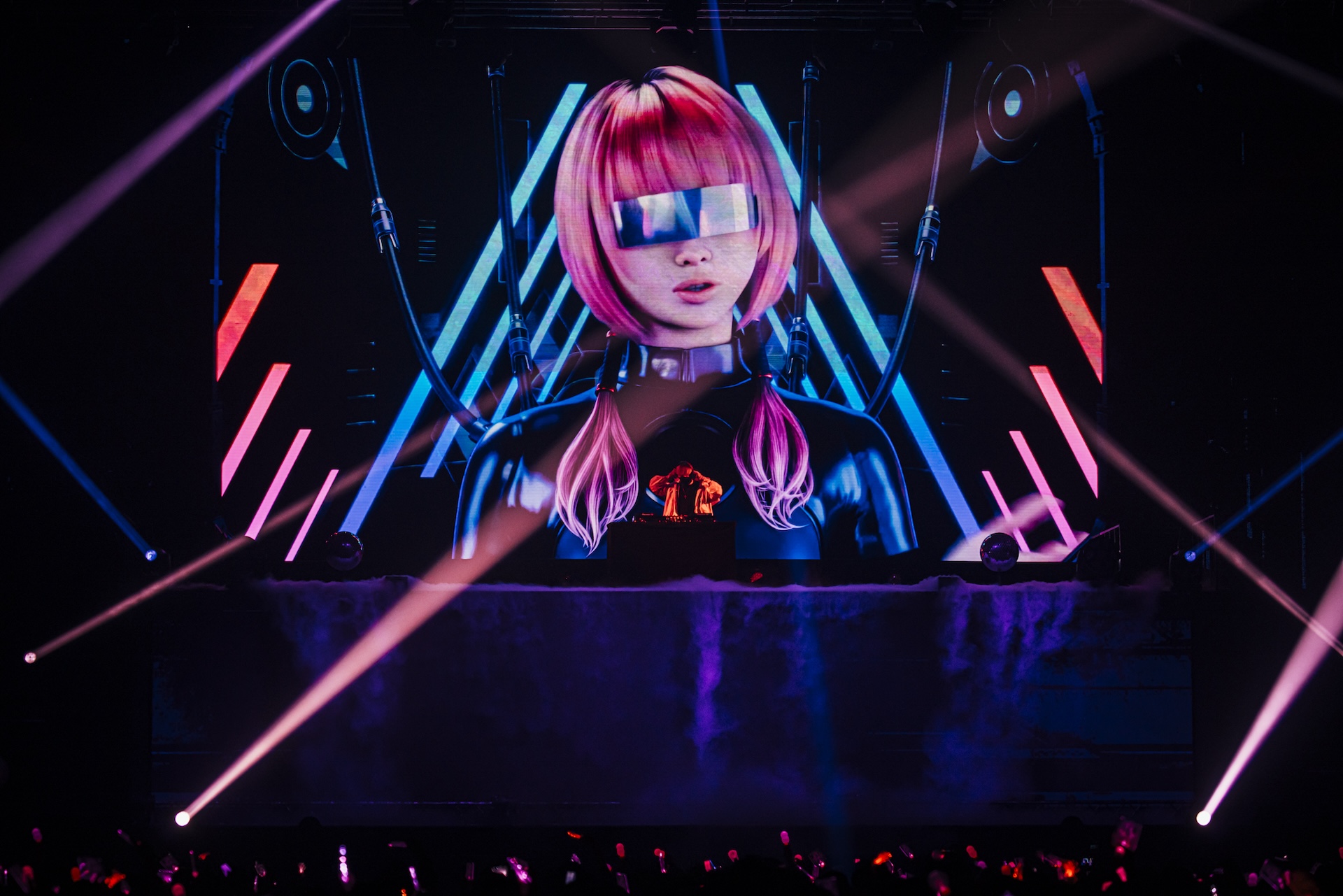 ここで最後のコラボ相手であるMoe Shopが登場し、「notice」と新曲「My Life」を披露したのだが、彼の楽曲と同時に登場したのはステージスクリーン一杯まで巨大化したVIRTUAL BEING KAFだ。シンセ・サウンドと細やかなビート感、歪みがかかったエフェクティブな花譜のボーカル、そして黒のタイトなスーツを着た巨大なVIRTUAL BEIING KAFと、SF感マシマシなムードが会場を包みこんだのだった。