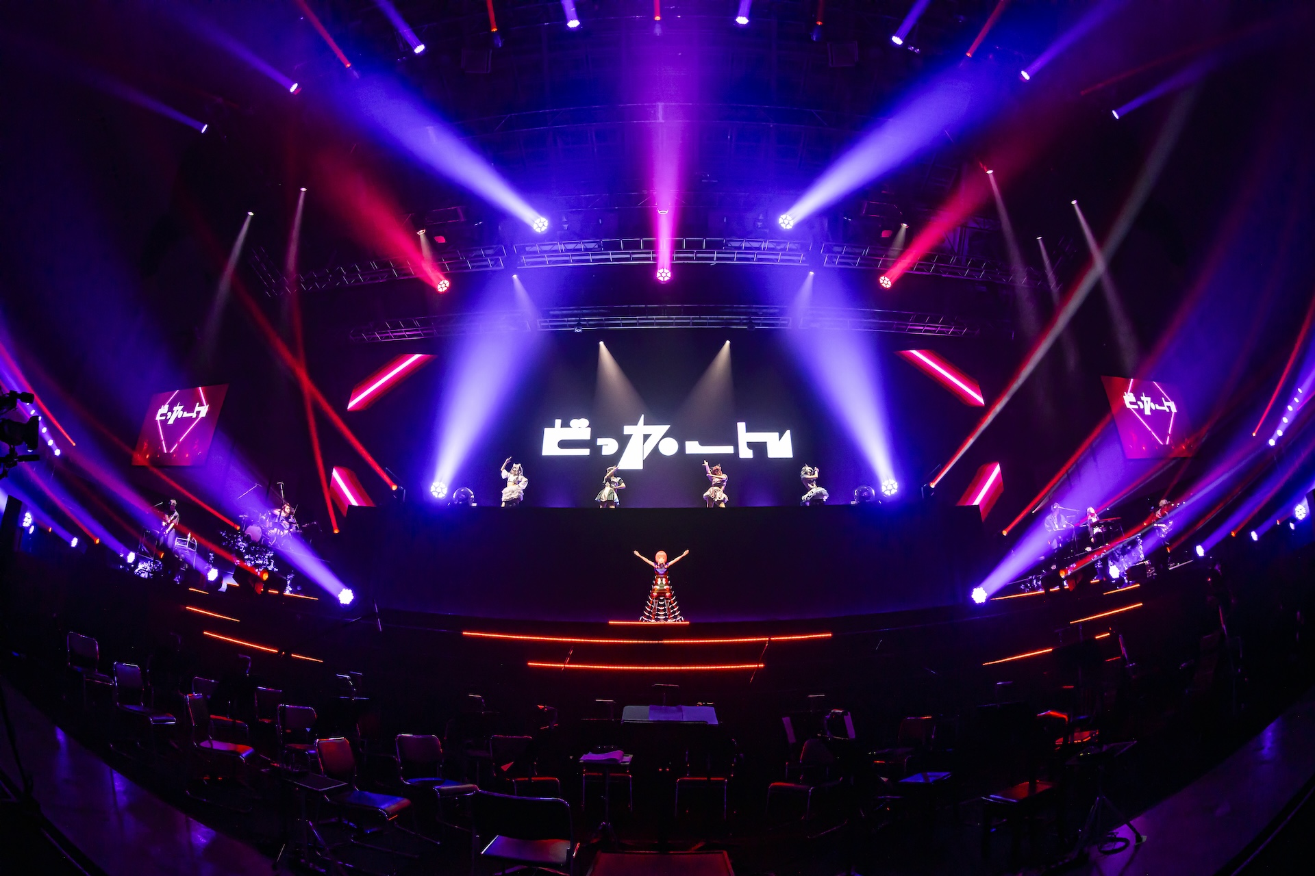 2曲目「未観測」へとつながると、青・紫の照明が会場を照らすなか、強いドラミングに合わせたアップテンポなバンドアンサンブルとともに花譜も自身の歌をバッチリ決めてみせる。バンド隊とストリングスによる音の厚みにも、花譜の歌声は負けることなく会場に響く。