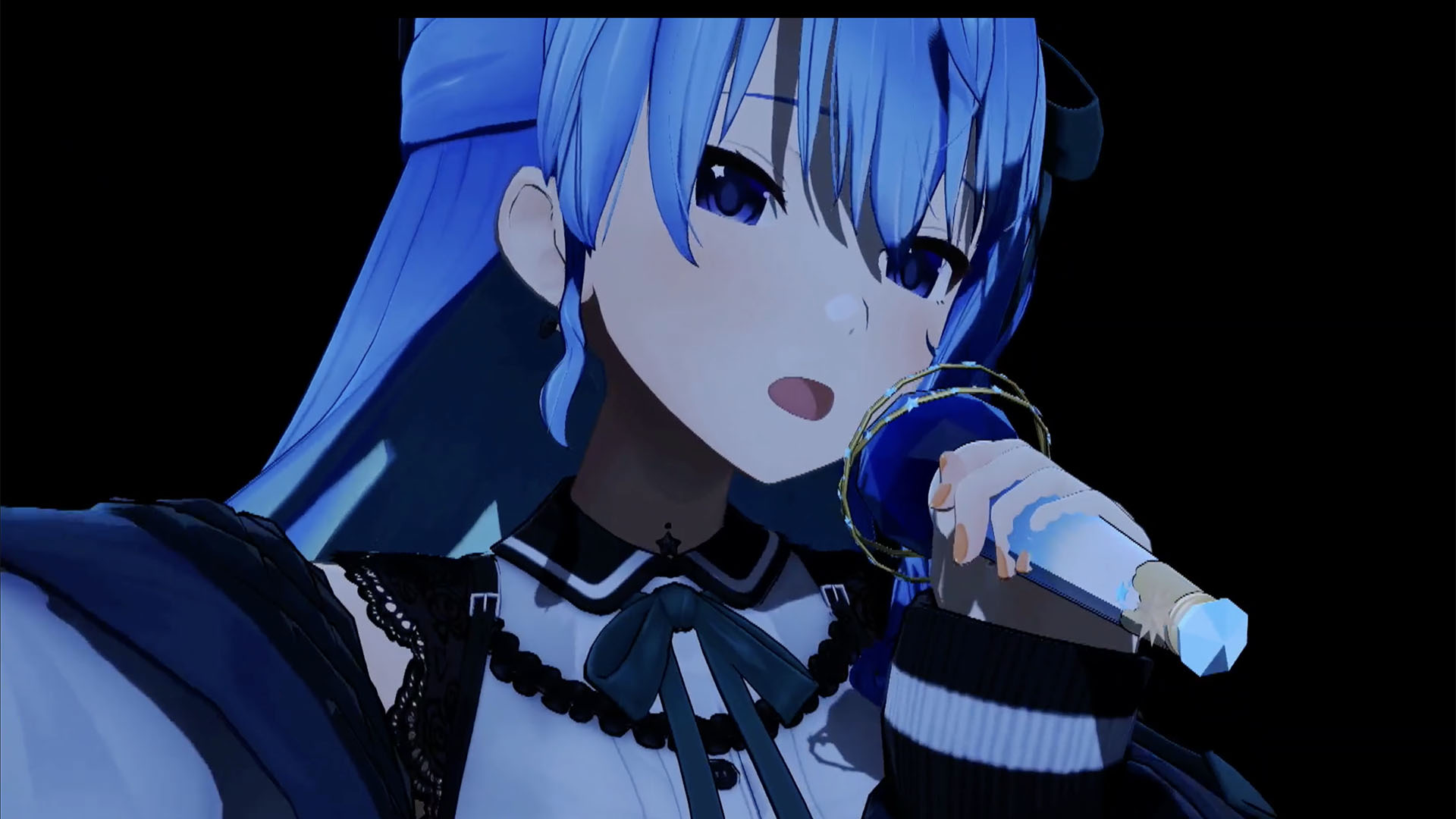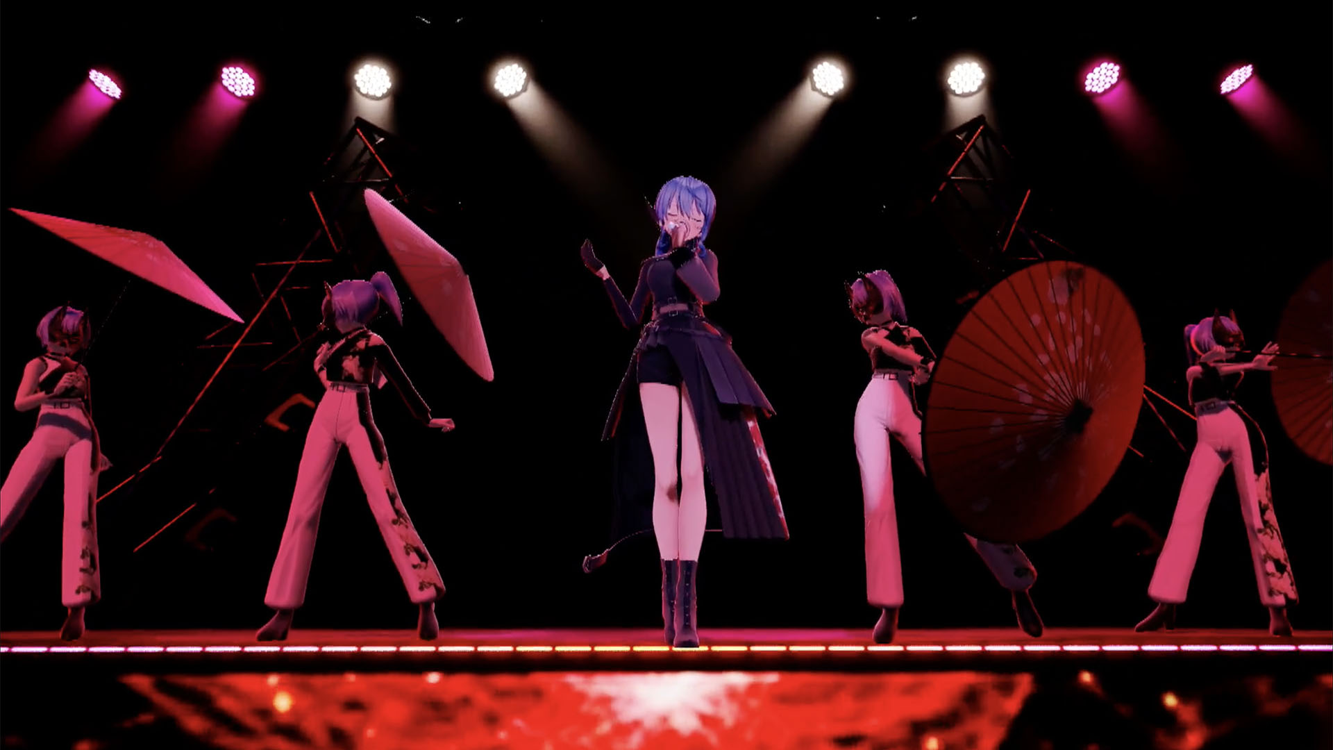 「みちづれ」では、曲調がさきほどから打って変わってスウィンギーなグルーヴに和風なサウンドアレンジがからまり、ダンサー4人が和傘を使った踊りを見せてくれる。星街も「Shout in Crisis」でお披露目したブラックな衣装へチェンジ。しかもこの衣装、黒色のあいだに花柄がスッと入り、スカートには右足を大胆にみせるスリットも入っていて、この曲の華やかさやなまめかしさにバッチリと合う。加えて艶やかな声色とボーカルを披露するのだから、会場も彼女にウットリとしたことだろう。