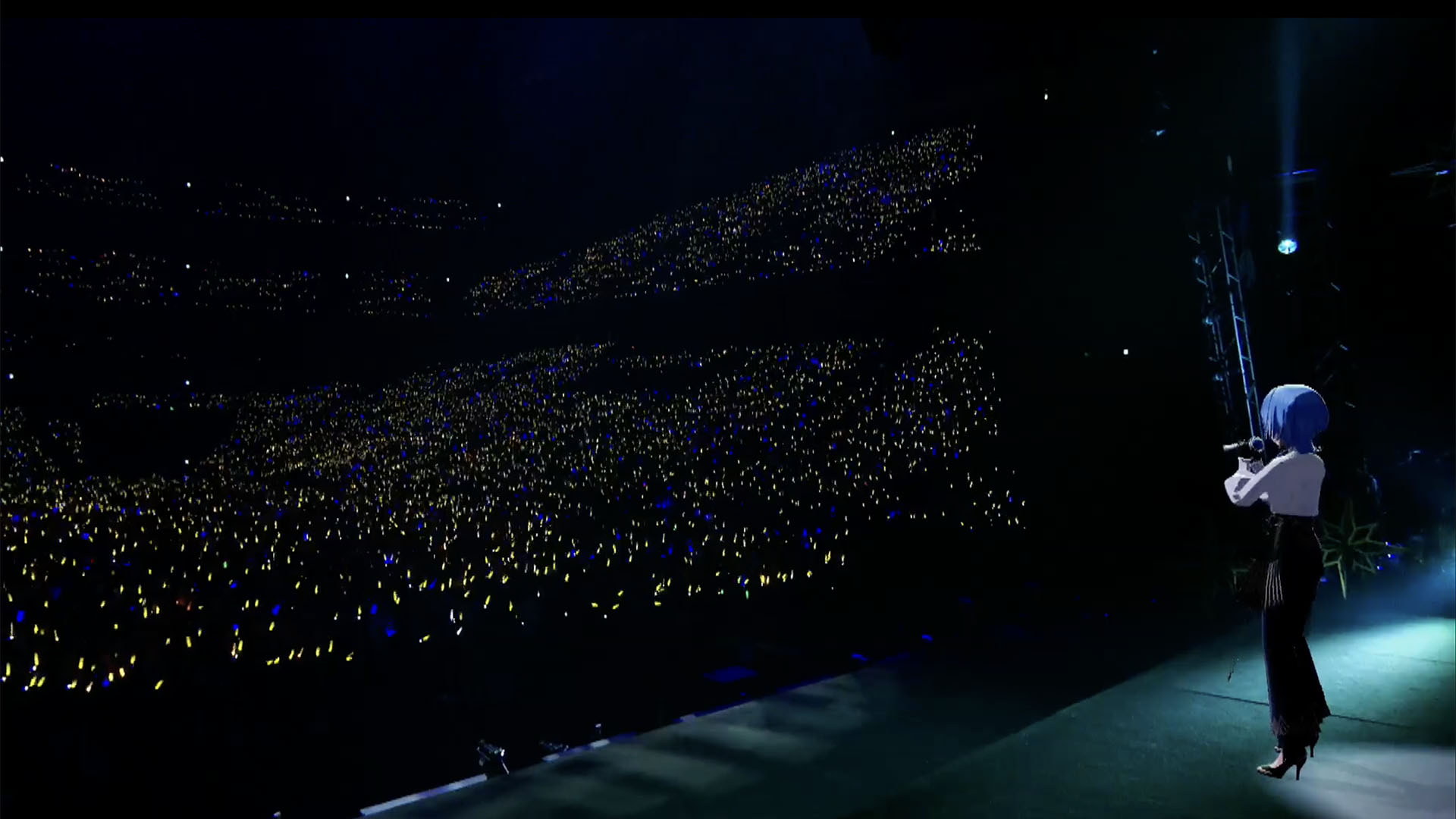 アグレッシブなギターリフとドラミングによるアッパーなバンドサウンドに乗っかり、星街のボーカルが一気に放たれる。星街のイメージカラーである青だけでなくオレンジ色のペンライトも観客は振っている。