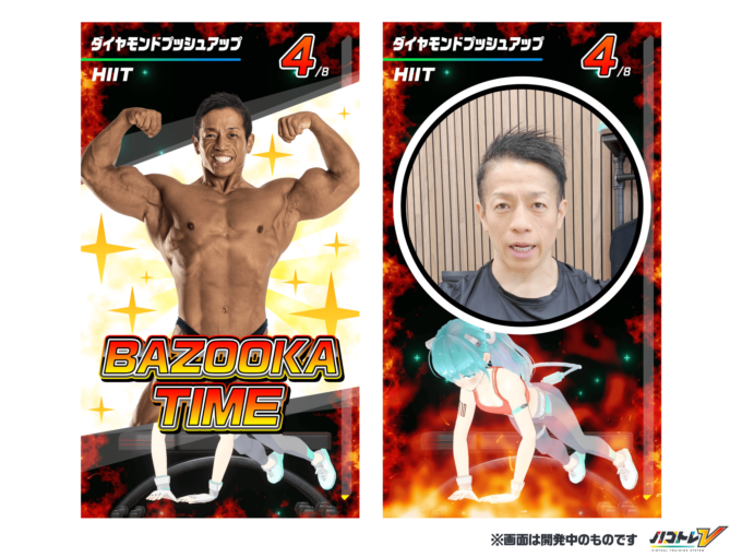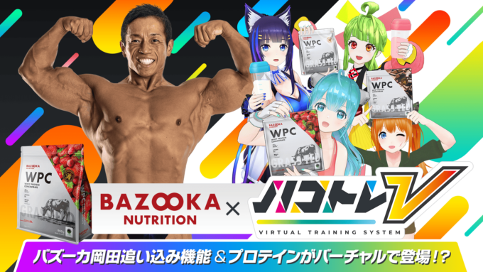 VTuberイトッポイドとハコジムは25日、等身大ディスプレイでVTuberと筋トレができるフィットネスゲーム「ハコトレV」にて、日本体育大学教授でボディビルダーとしても活躍するバズーカ岡田とスペシャルコラボの実施を発表。本コラボでは、バズーカ岡田がプレイヤーのトレーニングを全力で応援する「バズーカ岡田追い込み機能 BAZOOKA TIME」が登場。さらにバズーカ岡田監修・開発のプロテイン「BAZOOKA NUTRITION」がゲーム内の3D空間に登場し「トレーニング後にVTuberとプロテインで乾杯する」スペシャルな記念写真が撮影が可能になっている。