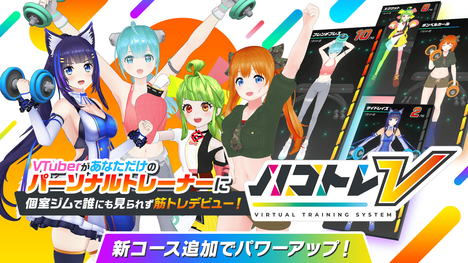 筋トレ好きVTuberとトレーニングコーチ監修の下、運動不足解消の有酸素トレーニングから、ボディメイク向けの自重トレーニング、さらにジムのダンベルを使った経験者向けの高負荷メニューまで対応。正式リリースへ向けて開発中である。