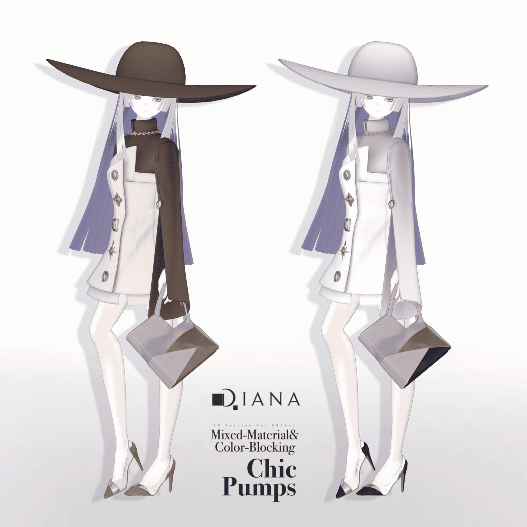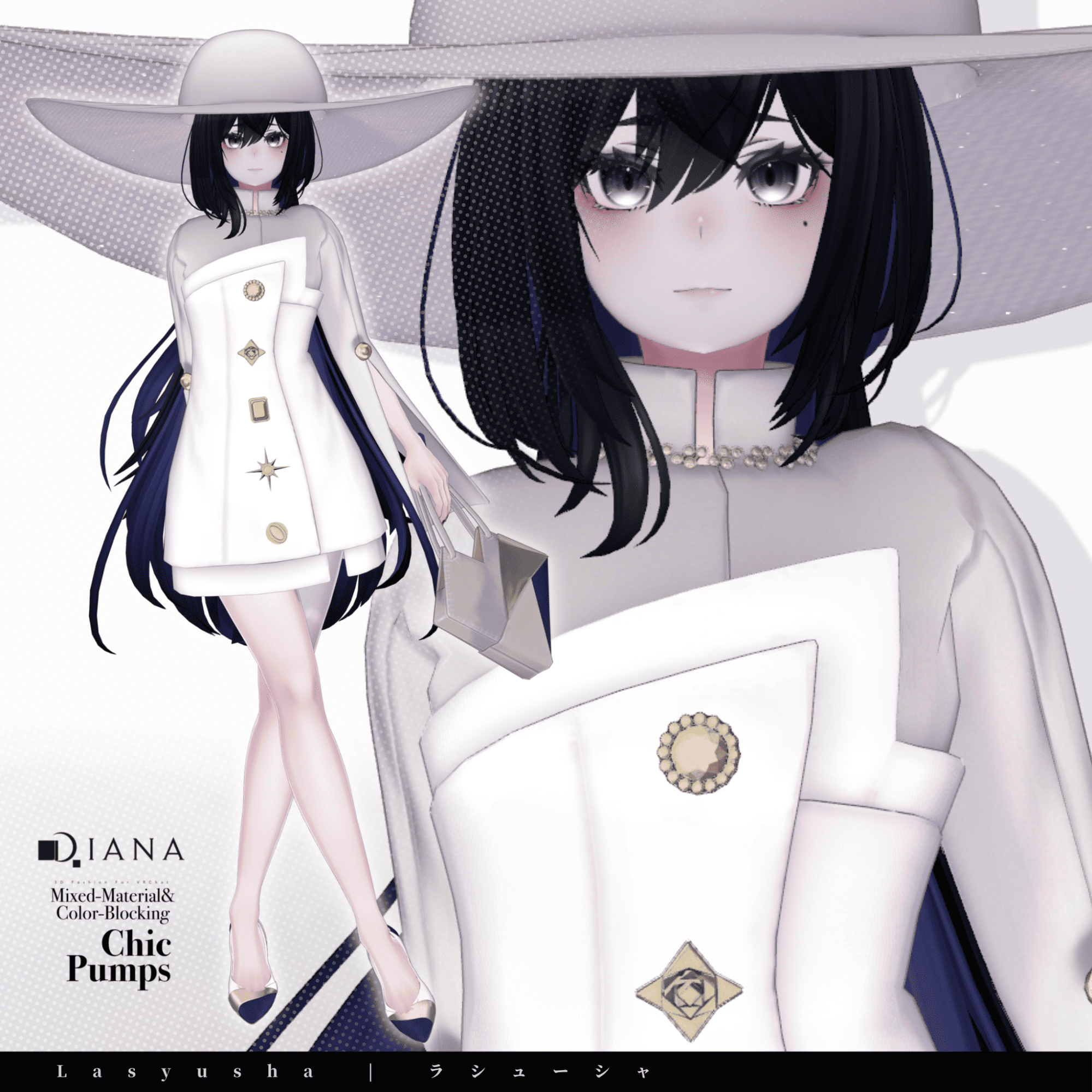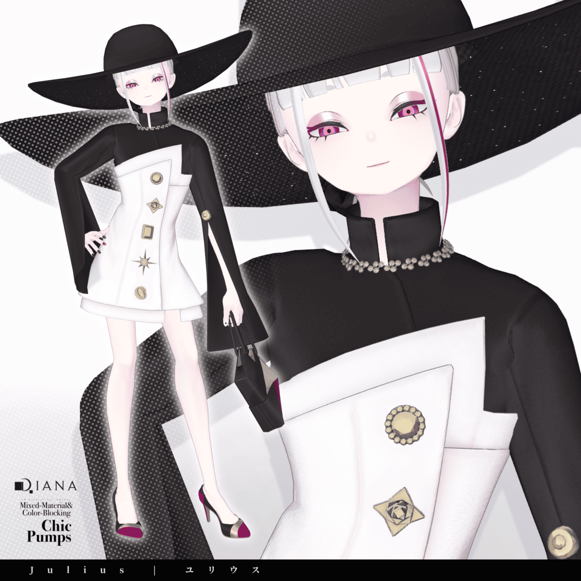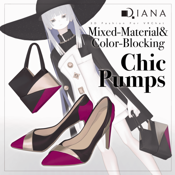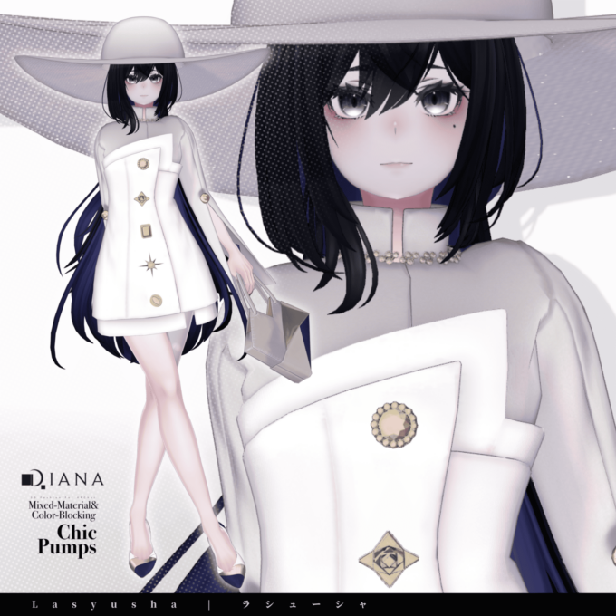 第1弾で発売される商品セットには「パンプス」「バッグ」「ドレス」「ハット」の4つのアイテムが付属。パンプスとバッグはダイアナのオリジナルデザイン、ドレスとハットはメタバースファッションブランド「Pochi by KT」とのコラボアイテムとなっている。価格は衣装1着2000円、全セットで5000円(いずれも税込)。