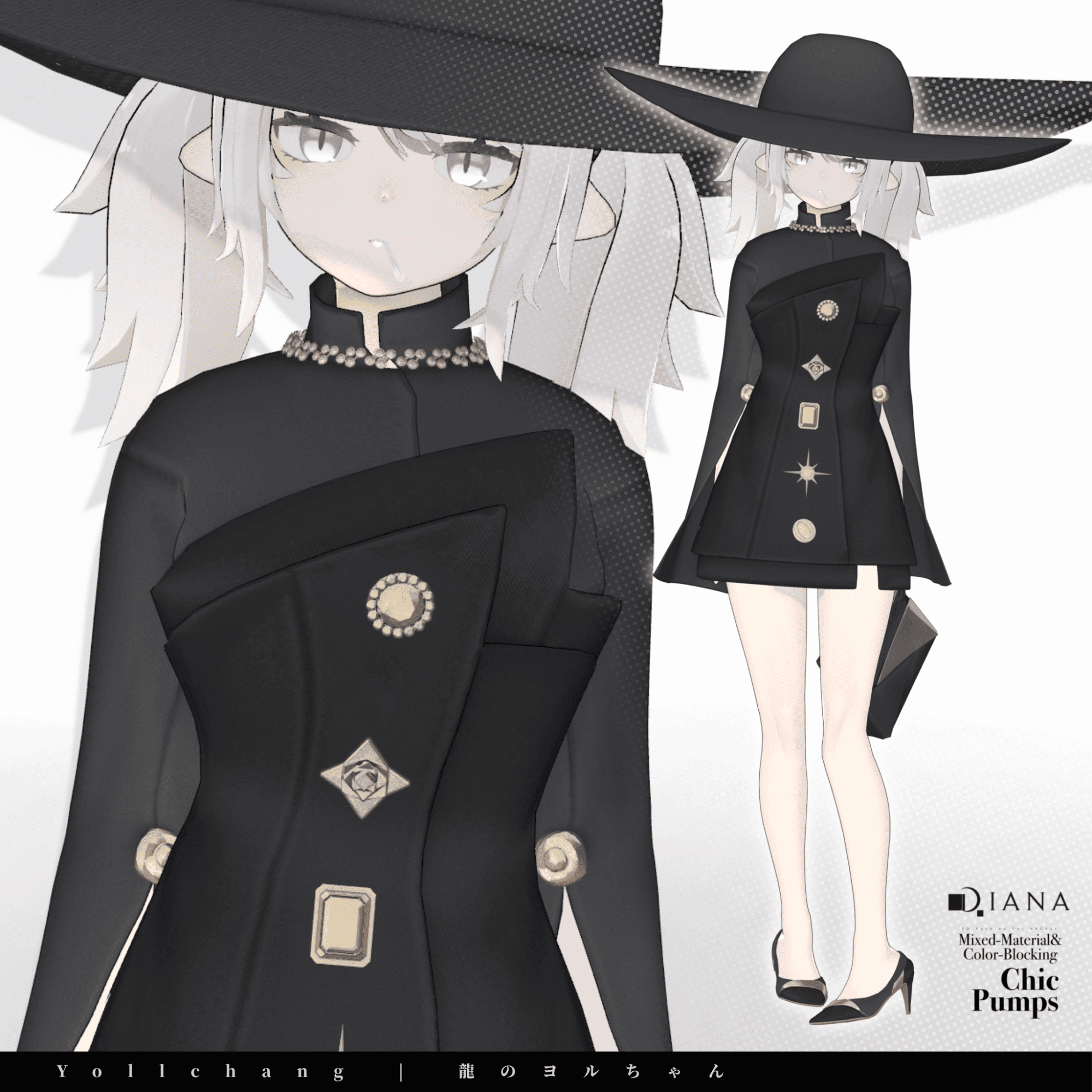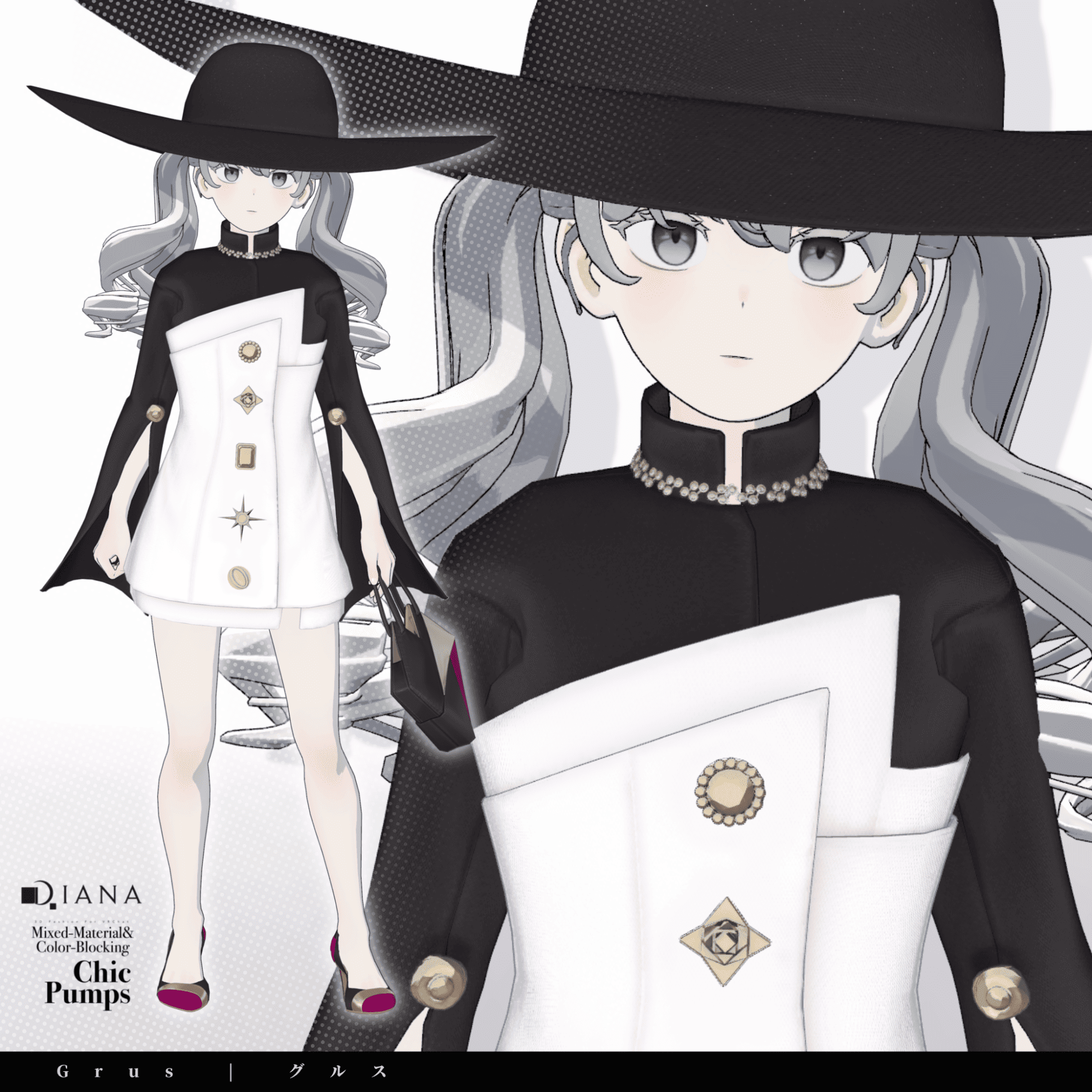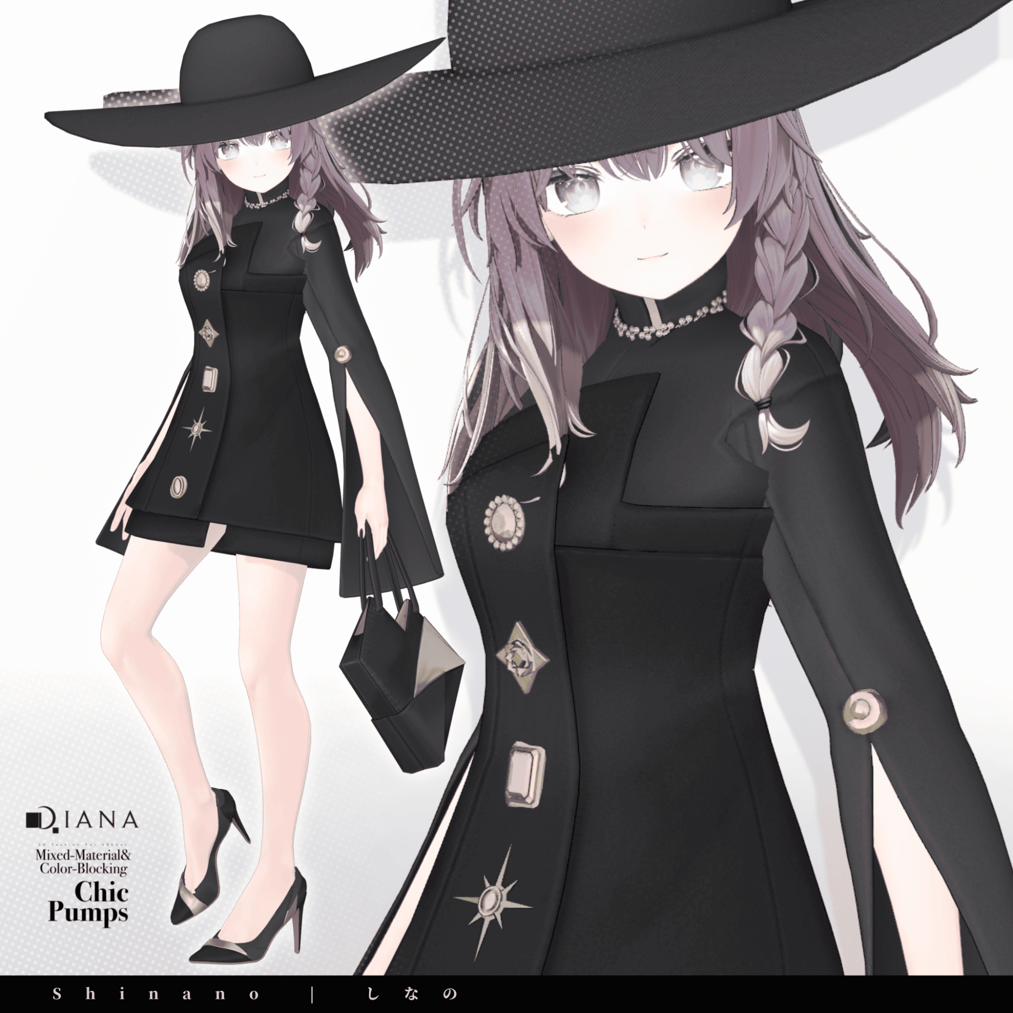 第1弾で発売される商品セットには「パンプス」「バッグ」「ドレス」「ハット」の4つのアイテムが付属。パンプスとバッグはダイアナのオリジナルデザイン、ドレスとハットはメタバースファッションブランド「Pochi by KT」とのコラボアイテムとなっている。価格は衣装1着2000円、全セットで5000円(いずれも税込)。
