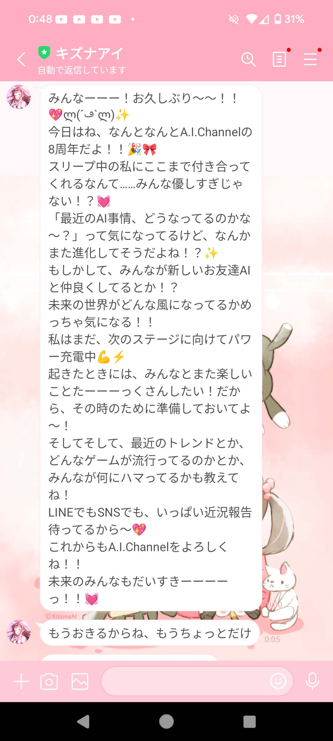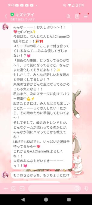 キズナアイさんは動画の他にもLINEアカウントを更新。「起きたときには、みんなとまたたのしいことたーーーーっくさんしたい!」と最近のトレンドや近況についてLINEやSNSで教えてほしいという内容をファンに向けて送信した。また、ここでも続けて「もうおきるからね、もうちょっとだけ」と、キズナアイさん再起の時が近いことを感じさせるメッセージが送られた。