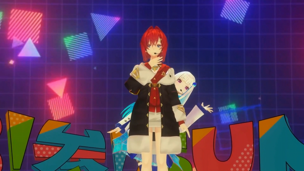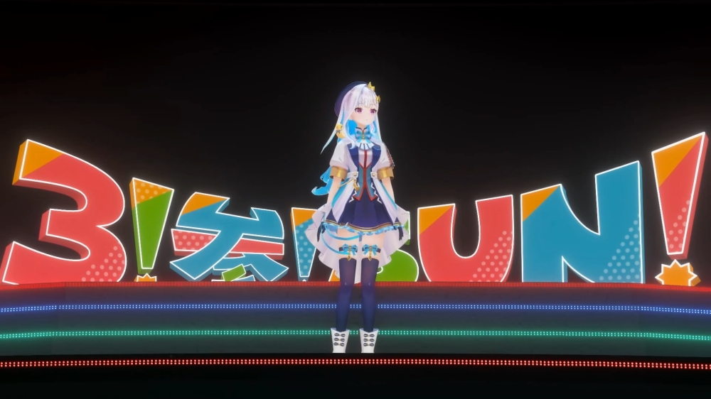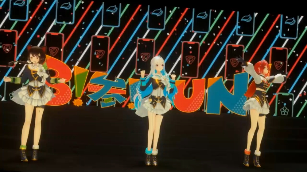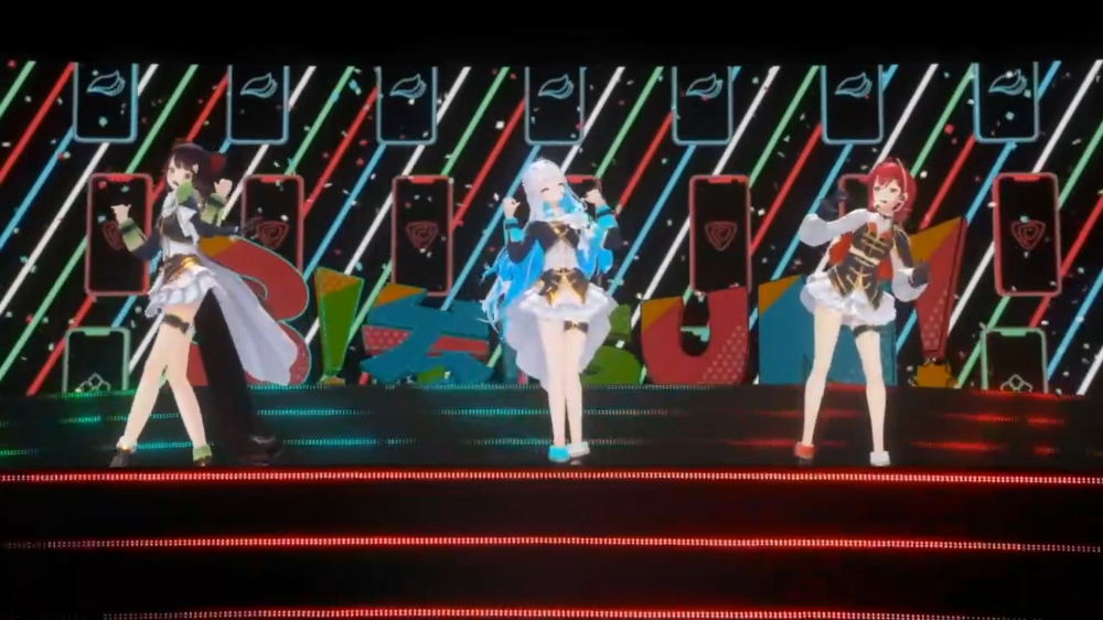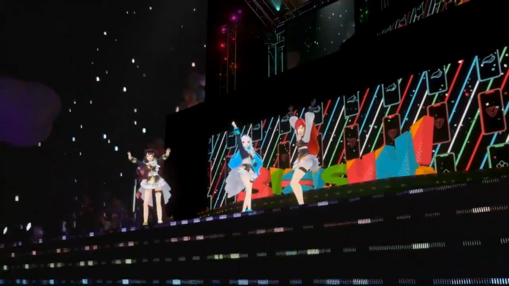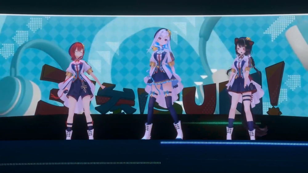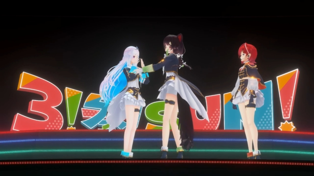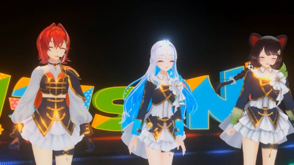 しかし、ステージに3人の姿は見えず、歌詞が飛び跳ねるポップな映像が流れるだけ。すると、「アンジュどこ!」「戌亥ここ!」「リゼひよこ!?」からの「ハイ!」の声に合わせて、3人がステージ下から飛び出て来る。リアルアーティストのライブでは定番の奈落からのポップアップによる登場だが、VTuberのライブでは珍しい。さんばかオリジナルのお揃いのアイドル衣装に身を包んだ3人は、ステージに登場した瞬間から満面の笑顔。4人編成の生バンドによる演奏と共に会場を一気に盛り上げて、カーニバルにしてしまった。