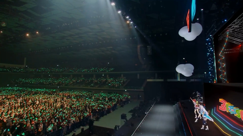 ライブのキービジュアルや軽快な音楽で構成されたオープニング映像の後、さんばかの1stオリジナル曲「3倍!Sun Shine!カーニバル!」のメロディと歌声が聴こえ、ついにさんばかの5周年ライブが開演。公演の2日前から3人のYouTubeチャンネルで「3倍!Sun Shine!カーニバル!」のコーレス(コール&レスポンス)を練習するショート動画も公開されていたため、セットリストの中に入っていることは確信していたが、1曲目だったことに少し意表を突かれた。