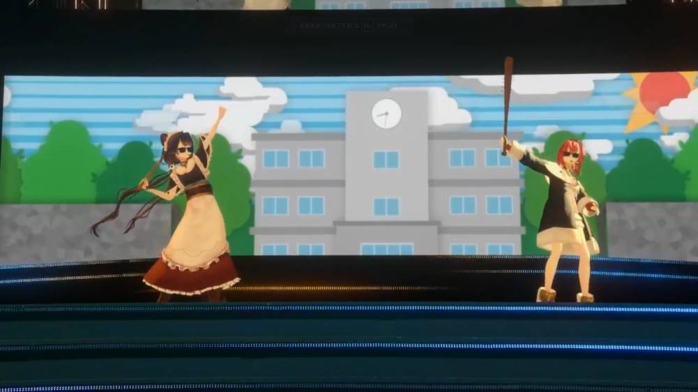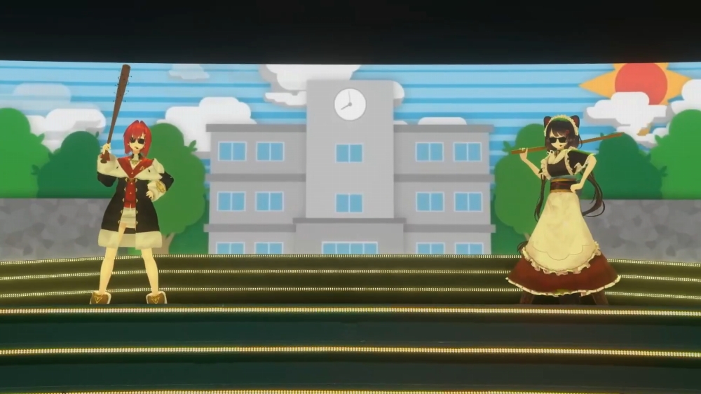 「リゼアン」「ひめべろす」に続いては、「とこアン」のデュエット。木刀を持ってサングラスをかけた戌亥と、釘バットを持ってサングラスをかけたアンジュは、やんちゃなテンションで「ツッパりHigh School Rock’n Roll(登校編)」を披露する。
