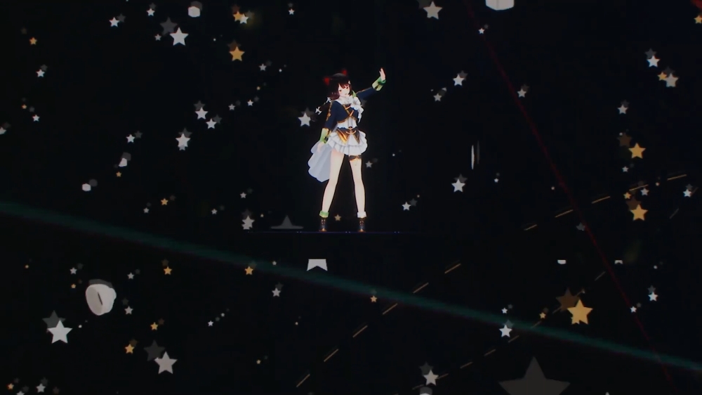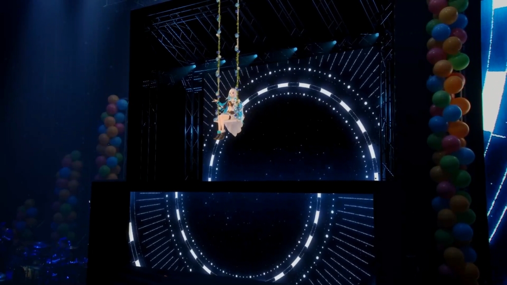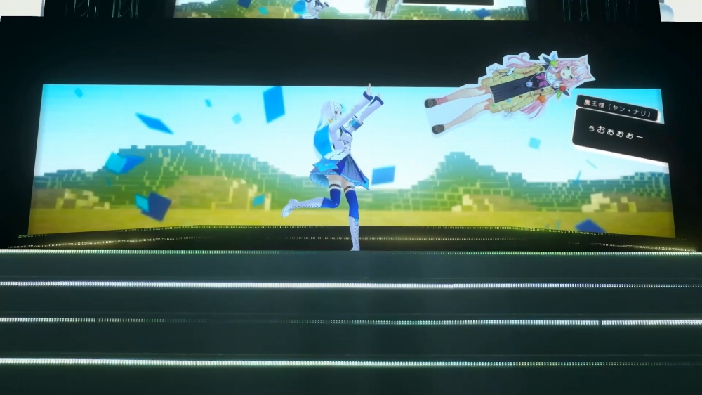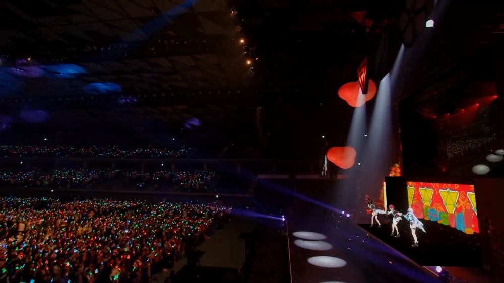 開演前、アリーナエリアに並んだ椅子を見ると、左右に1本ずつ極端に広い通路があったため、「声優かアイドルのライブだったら、ここをトロッコが走るだろうな」とは思ったのだが、VTuberのライブでもまさかの実現。ディスプレイは透明で、3人は自由に向きを変えながら、通路の両側の客席に手を振り声をかけ、ファンサしていく。