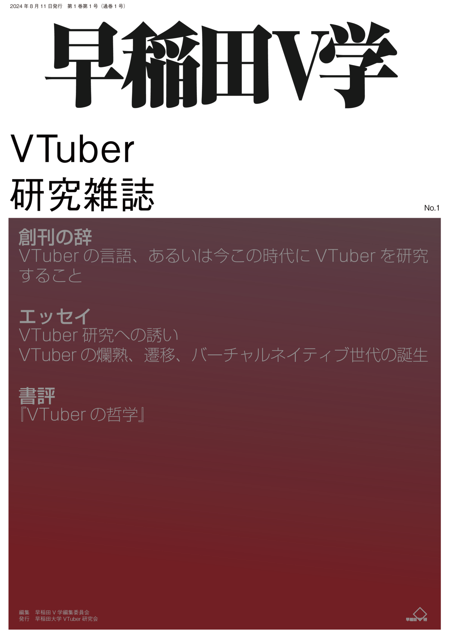 早稲田大学VTuber研究会は20日、コミックマーケット105にてVTuber研究雑誌「早稲田V学」を頒布することを発表。早稲田V学は、VTuber研究における研究発表・議論の場としての機能と、VTuberやVTuber史に関する情報の集積拠点としての機能の、二つの機能を果たすことを目指す「VTuber研究雑誌」だ。 コミックマーケット105では同会の他の刊行物及び他サークルからの委託物の頒布も行われる。