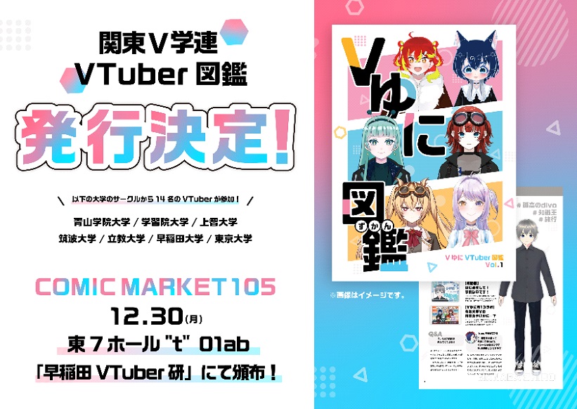 関東VTuber学連は26日、「VゆにVTuber図鑑」Vol.1を、コミックマーケット105にて頒布することを発表。VゆにVTuber図鑑は、関東VTuber学連に所属する7大学のサークルと14名のVTuberを紹介する合同誌。複数の大学に所属するVTuberを1冊にまとめた関東VTuber学連初の刊行物となっている。頒布は「早稲田VTuber研」ブースで行われる予定だ。