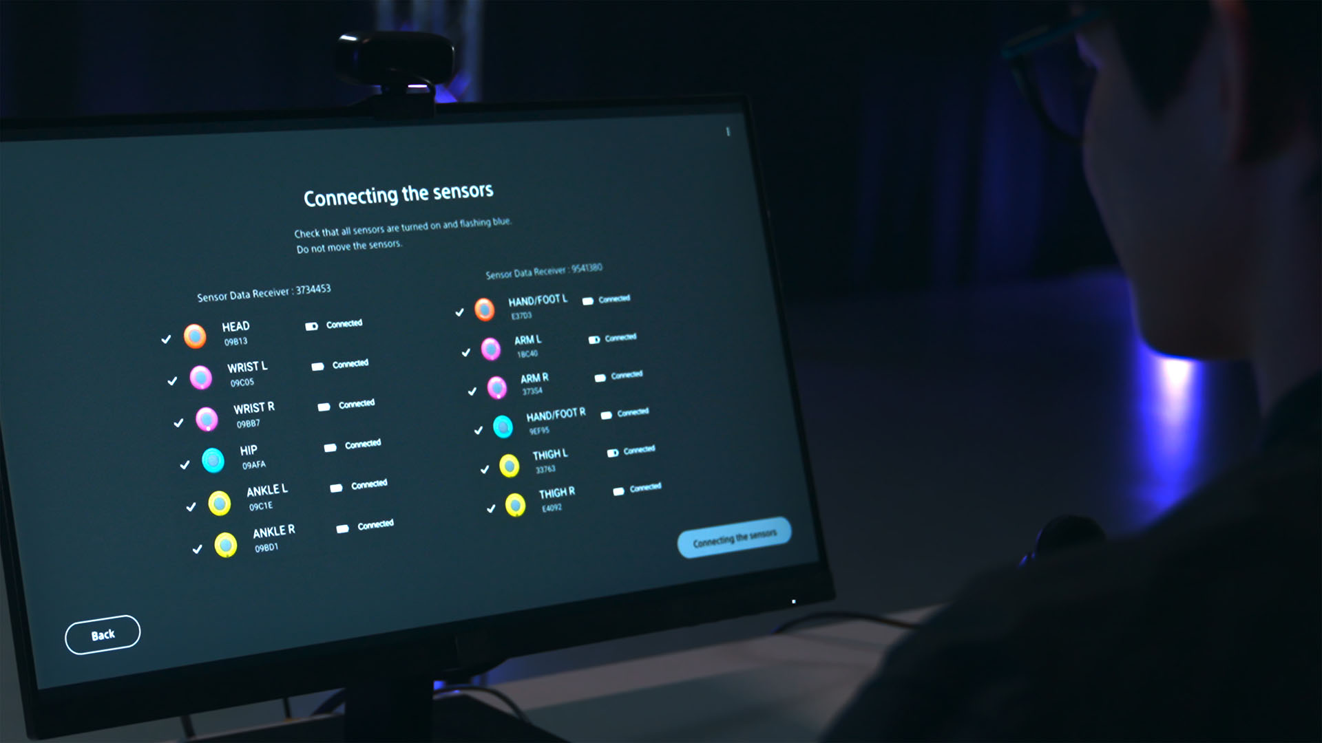 12点トラッキングでは、既存のmocopiを2セット用意し、新たにセンサーバンド「QM-PB1」を使って、頭1点、腰1点、手首2点、足首2点、腕2点、太もも2点、手の甲か足の甲2点という位置に装着。2基のセンサーデータレシーバー「QM-PR1」をPCに繋いで、Bluetoothで通信して動きを取得する。外部カメラのデータとmocopiのデータを合わせることでより精度を向上させるカメラブレンディング機能や、接地精度の改善なども盛り込んだ。