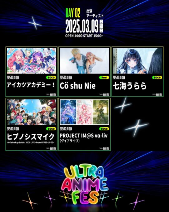 3月9日出演アーティスト:アイカツアカデミー! 【3DCG LIVE】、Cö shu Nie、七海うらら 【3DCG LIVE】、PROJECT IM@S  vα-liv(ヴイアライヴ)【3DCG LIVE】 、ヒプノシスマイク -Division Rap Battle- 3DCG LIVE ~From HYPED-UP 02~ 【3DCG LIVE】