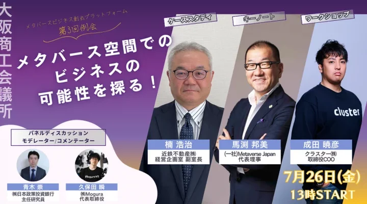 大阪商工会議所 大阪商工会議所は、2024年7月26日(金)に「メタバース空間でのビジネスの可能性を探る!」をテーマとしたセミナーを開催いたします。本セミナーは、メタバースビジネス創出プラットフォームの第3回例会として実…