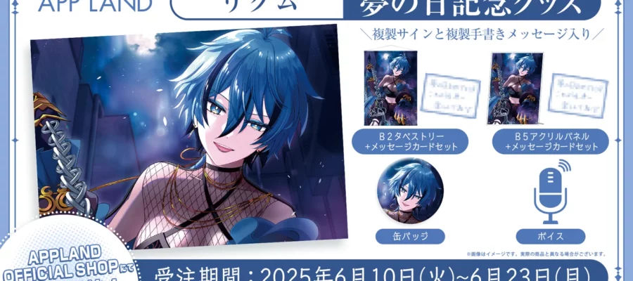 株式会社アップランド 6月10日(火)に夢の日を迎えるリクムの夢の日記念グッズ&ボイスを、当社が運営する公式グッズ販売サイト(APPLAND OFFICIAL SHOP)にて販売いたします!記念ボイスにはVRバー…
