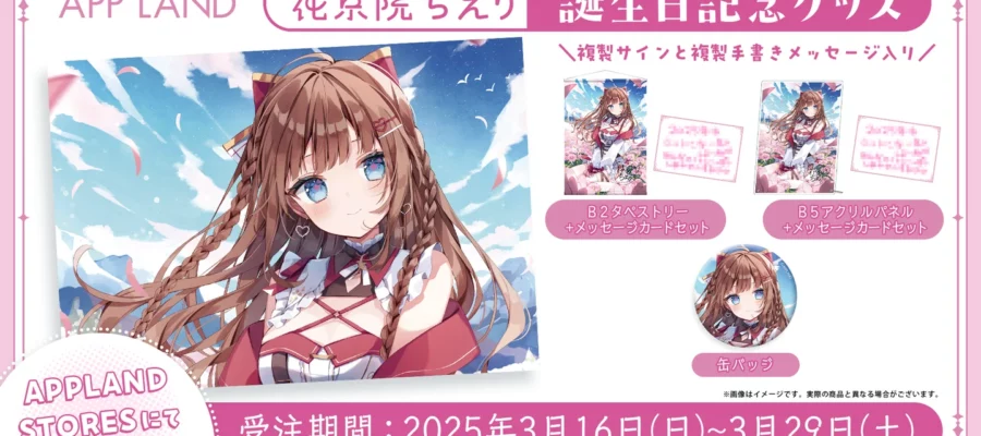 株式会社アップランド 3月16日(日)に誕生日を迎えた花京院ちえりの誕生日記念グッズ&ボイスを、当社が運営する公式グッズ販売サイト(STORES)にて販売開始!記念ボイスにはVRバージョンが用意されており、BOOTH上で…
