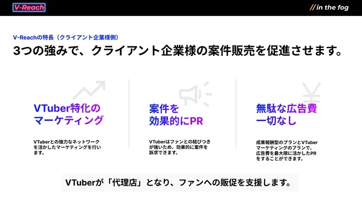 株式会社in the fog 株式会社in the fog(本社:渋谷、代表取締役:後藤 嵩弥)は、VTuberを活用した成果報酬型ソーシャルコマース・プラットフォーム「V-Reach」を2024年11月上旬より提供開始…