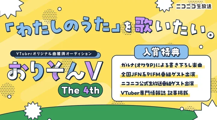 株式会社ドワンゴ ニコニコ事業本部 ニコニコでは、VTuberオリジナル曲獲得オーディション おりそんV The4th(読み:おりそんブイ ザ・フォース)の開催が決定しました。 今回の優勝者は、「パラジクロロベンゼン」「…