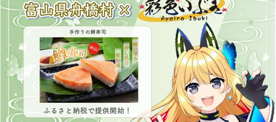 株式会社あるやうむ VTuber「彩色いぶき」と富山名物・鱒寿司がコラボをして富山県舟橋村のふるさと納税の返礼品として10月12日(日)21時より提供開始しました。返礼品は株式会社あるやうむ(本社:北海道札幌市、代表取締…