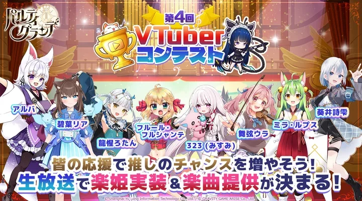 グラビティゲームアライズ株式会社 グラビティゲームアライズ株式会社(所在地:東京都中央区)は、『パルティグランデ』にて、5月30日(木)より、VTuber総勢8名がゲーム内実装をかけて奮闘する「第4回VTuberコンテス…