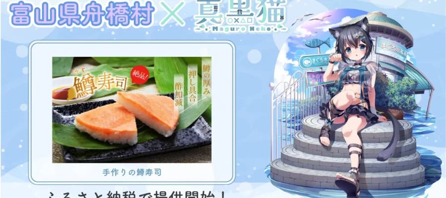 株式会社あるやうむ サーモン愛あふれるVTuber「真黒猫」と富山名物・鱒寿司がコラボをして富山県舟橋村のふるさと納税の返礼品として6月29日(日)より提供開始しました。返礼品は株式会社あるやうむ(本社:北海道札幌市、代…