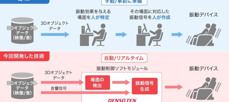 株式会社デンソーテン 株式会社デンソーテン(本社:兵庫県神戸市、代表取締役社長:加藤 之啓)は、映像・音響信号を含む3Dオブジェクトデータをもとに振動効果を与える場面・タイミングを自動で検出し、その場面の音響信号から、音…
