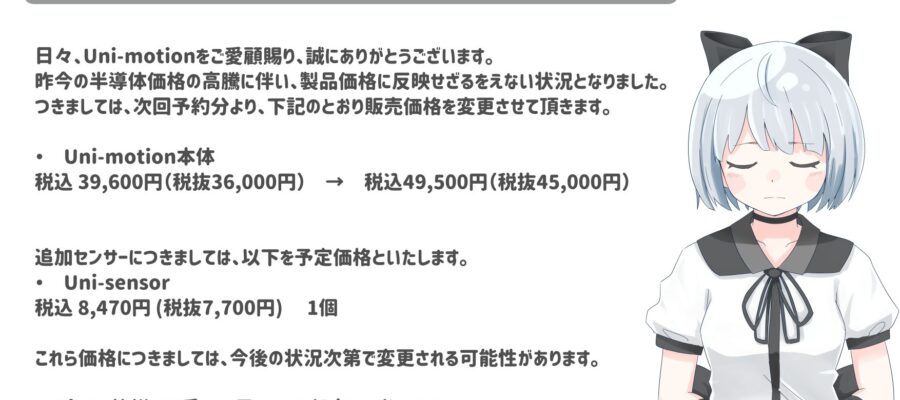 ユニ・デバイセズは、モーションキャプチャーシステム「Uni-motion」を価格改定し、従来の税込3万9600円から同4万9500円へ値上げすると発表した。約1万円の値上げとなる。 価格改定の理由は「半導体価格の高騰のた…