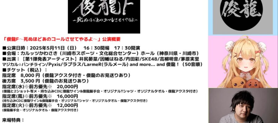 25日、ななしいんくの因幡はねるが作曲家・俊龍のプロデュースによる新曲『あくまで私のお友達の話です。』のリリースと、5月11日(日)に開催される俊龍の作った楽曲のみで構成するライブフェス「俊龍F ~死ぬほどあのコールさせ…
