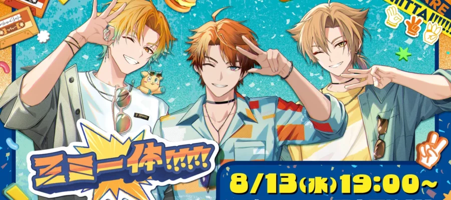 ANYCOLOR株式会社 2025年8月13日(水)19時「三ミ一体!!!!!!」グッズの販売開始! にじさんじから「三ミ一体!!!!!!」グッズの販売が決定! 参加ライバーは宇佐美リト、北見遊征、伏見ガクの3名。 グッ…