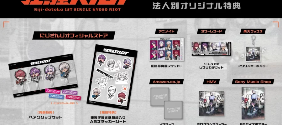 ANYCOLOR株式会社 2時だとか 1st Single『狂騒RIOT』予約受付中! 当社が運営するVTuber / バーチャルライバーグループ「にじさんじ」所属の渡会雲雀、不破湊、イブラヒム、ローレン・イロアスからな…