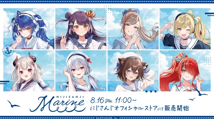 ANYCOLOR株式会社 2024年8月16日(金)11時から「にじさんじ マリン」グッズの販売を開始! 天宮こころ、海妹四葉、来栖夏芽、立伝都々、奈羅花、葉加瀬冬雪、文野環、レイン・パターソンの8名のにじさんじライバー…