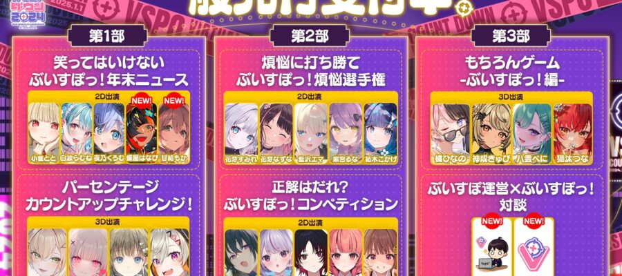Virtual e-Sports Project・ぶいすぽっ!・による年末イベント『ぶいすぽっ!年末カウントダウン2024』に、追加メンバー・追加企画の発表がなされた。 11月2日にデビューしたばかりの新人・蝶屋はなびと…