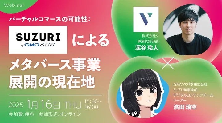 株式会社V 株式会社V(本社:東京都品川区、代表取締役兼CEO:藤原光汰、以下 V)は、2025年1月16日(木)15時より、第2回オンラインセミナー「バーチャルコマースの可能性:SUZURI byGMOペパボによるメタ…