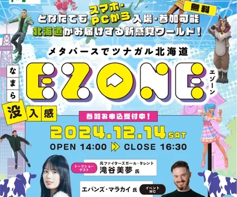 北海道 道では、12月14日(土)に、メタバースを利用したバーチャル空間での交流イベント「EZONE~WINTER EVENT」(全2回中第2回)を開催します。 ゲストには、札幌出身のタレントで元ファイターズガールの滝谷…