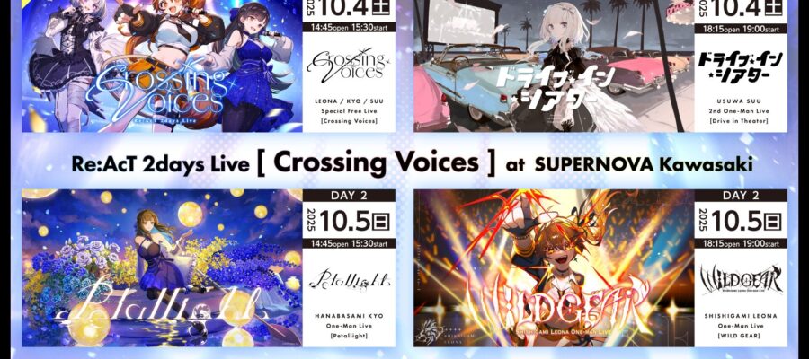 Re:AcTが10月4日~5日にSUPERNOVA KAWASAKIで開催するツーデイズライブ「Crossing Voices」の一般チケットが、現在発売中となっている。 1日2部制、2日間で4部にわたって開催される形と…